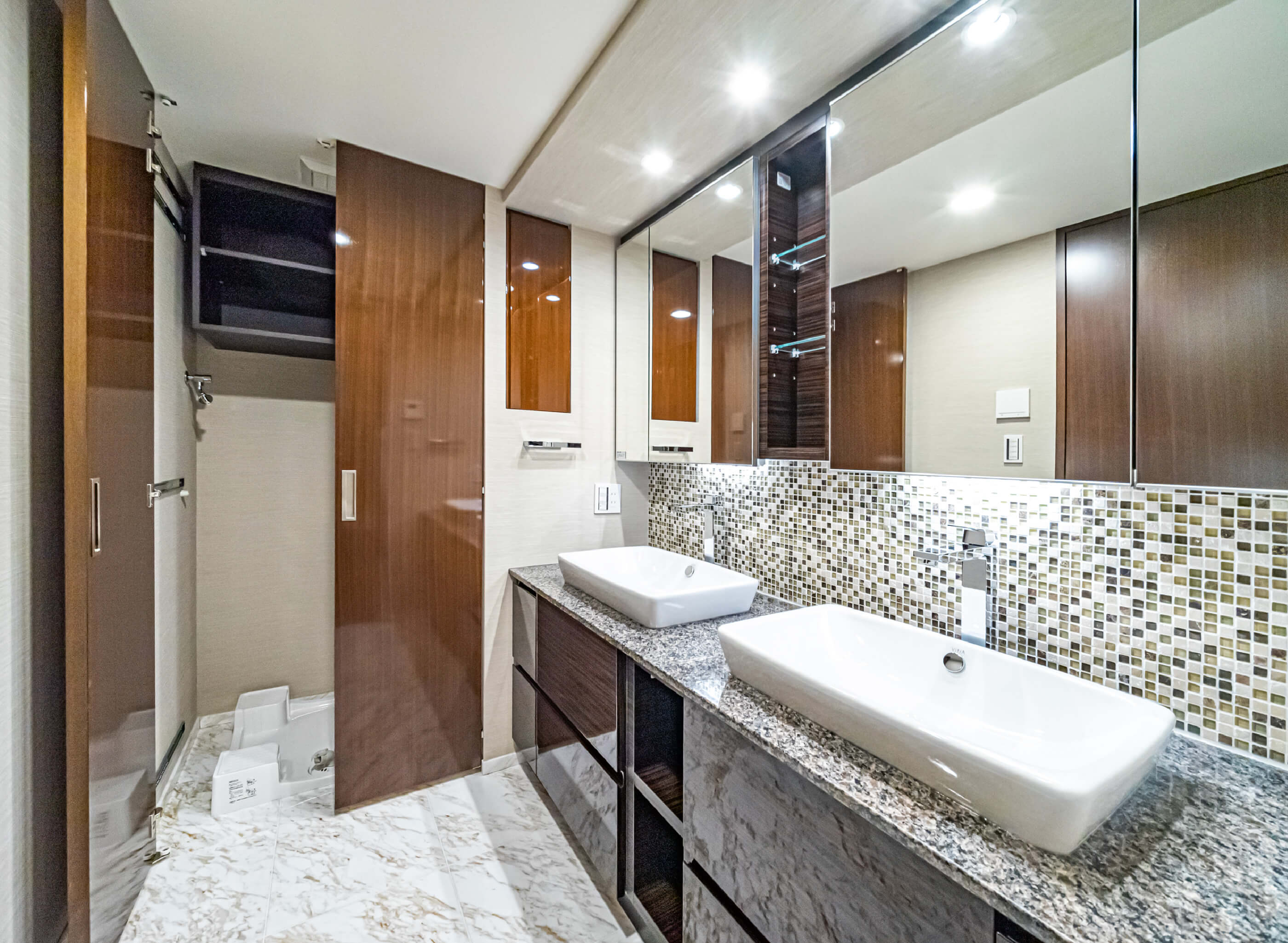 シューズインクロゼット等の豊富な収納 - 洗面台はタイル貼り、玄関にはミラー貼り等