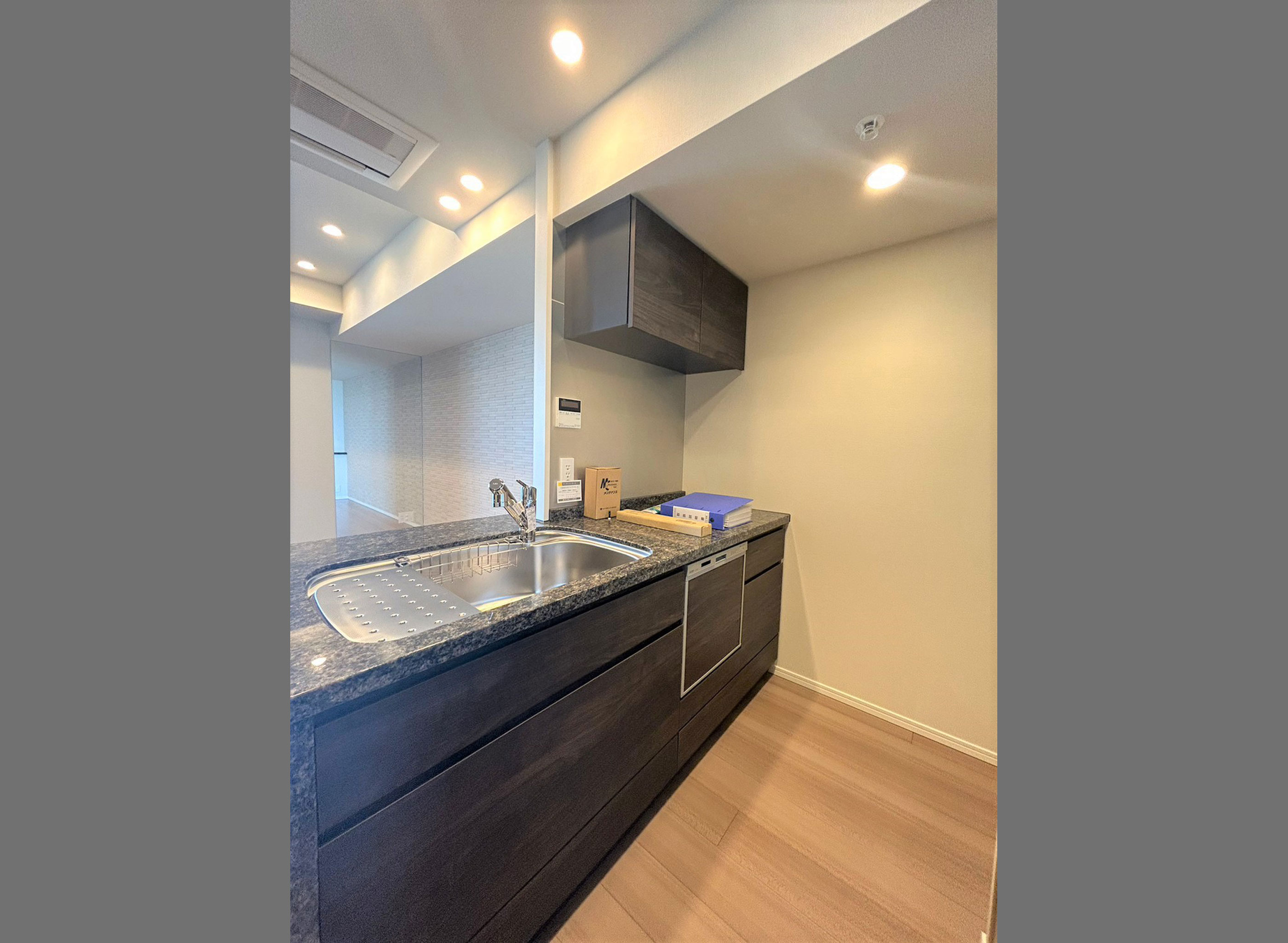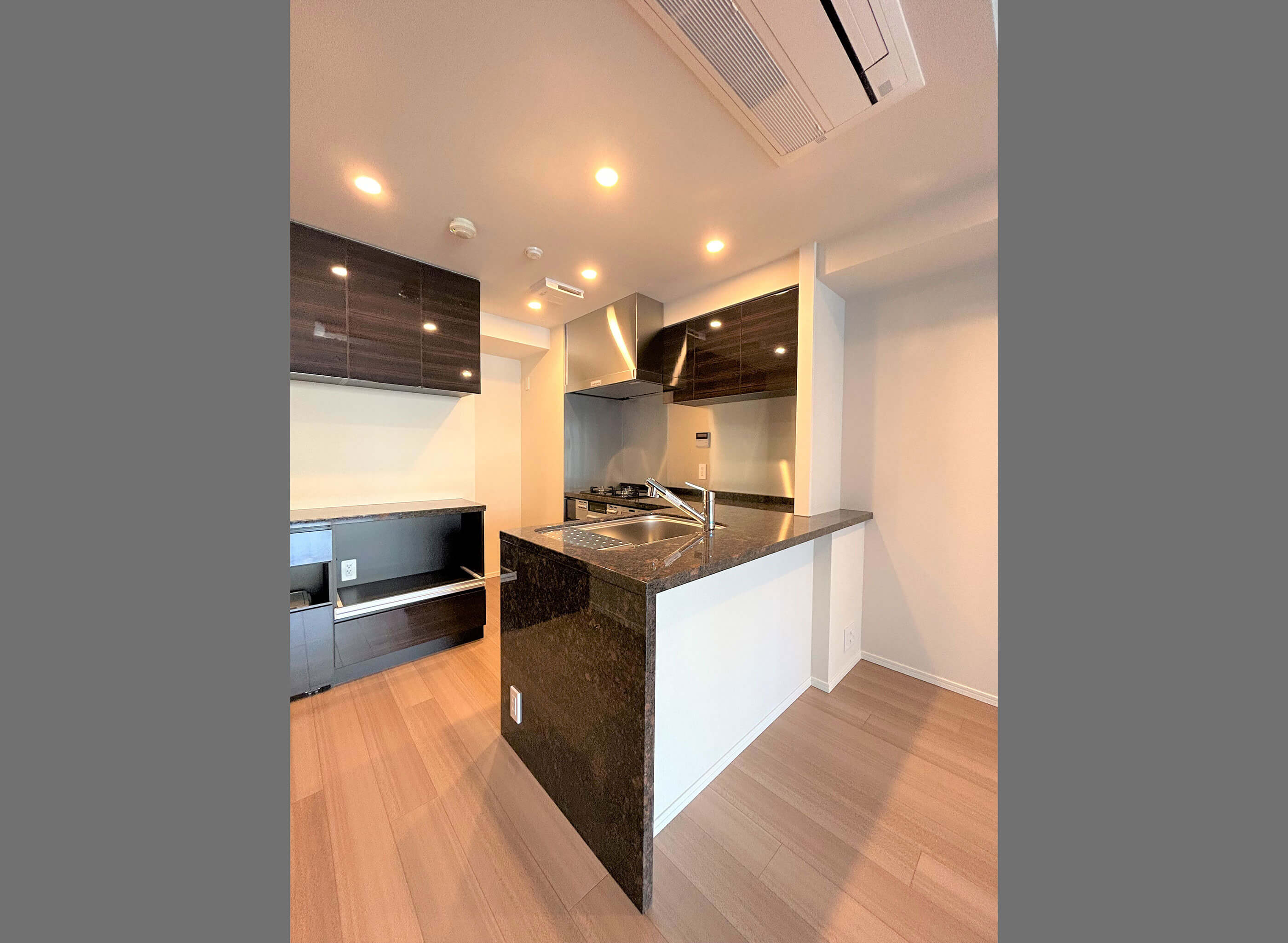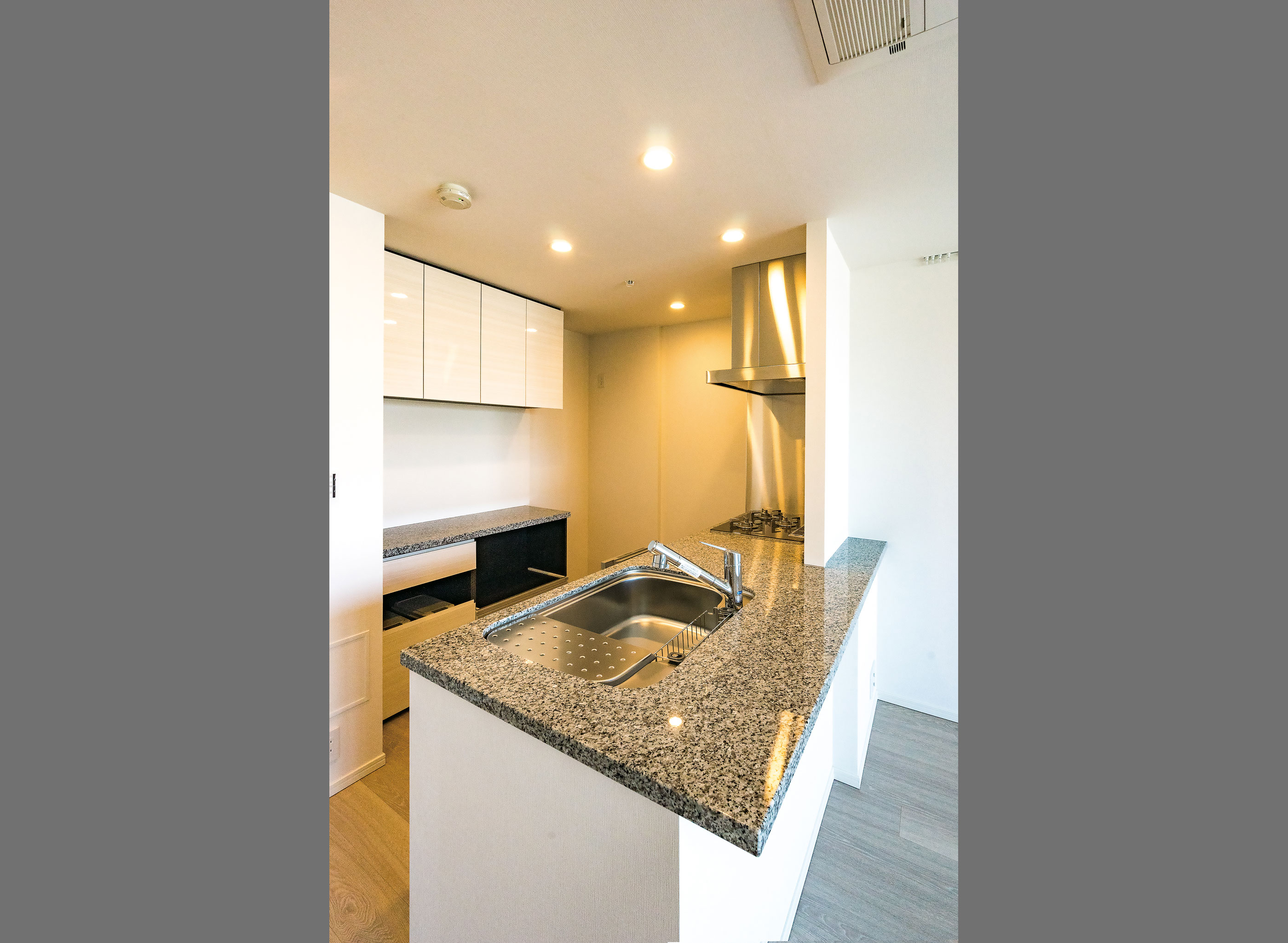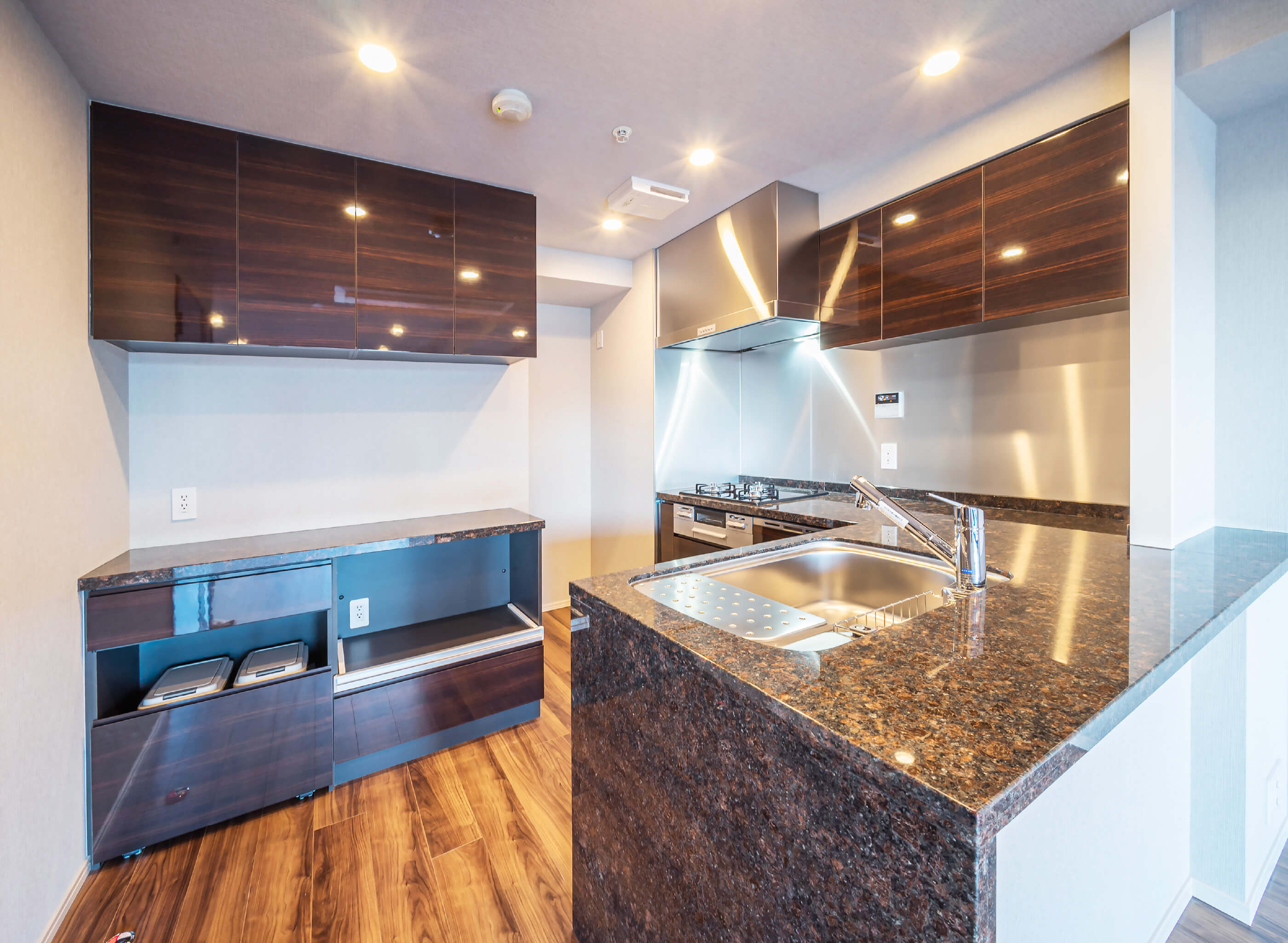 フラットカウンターキッチン - 調光ダウンライト・電動カーテンレール・