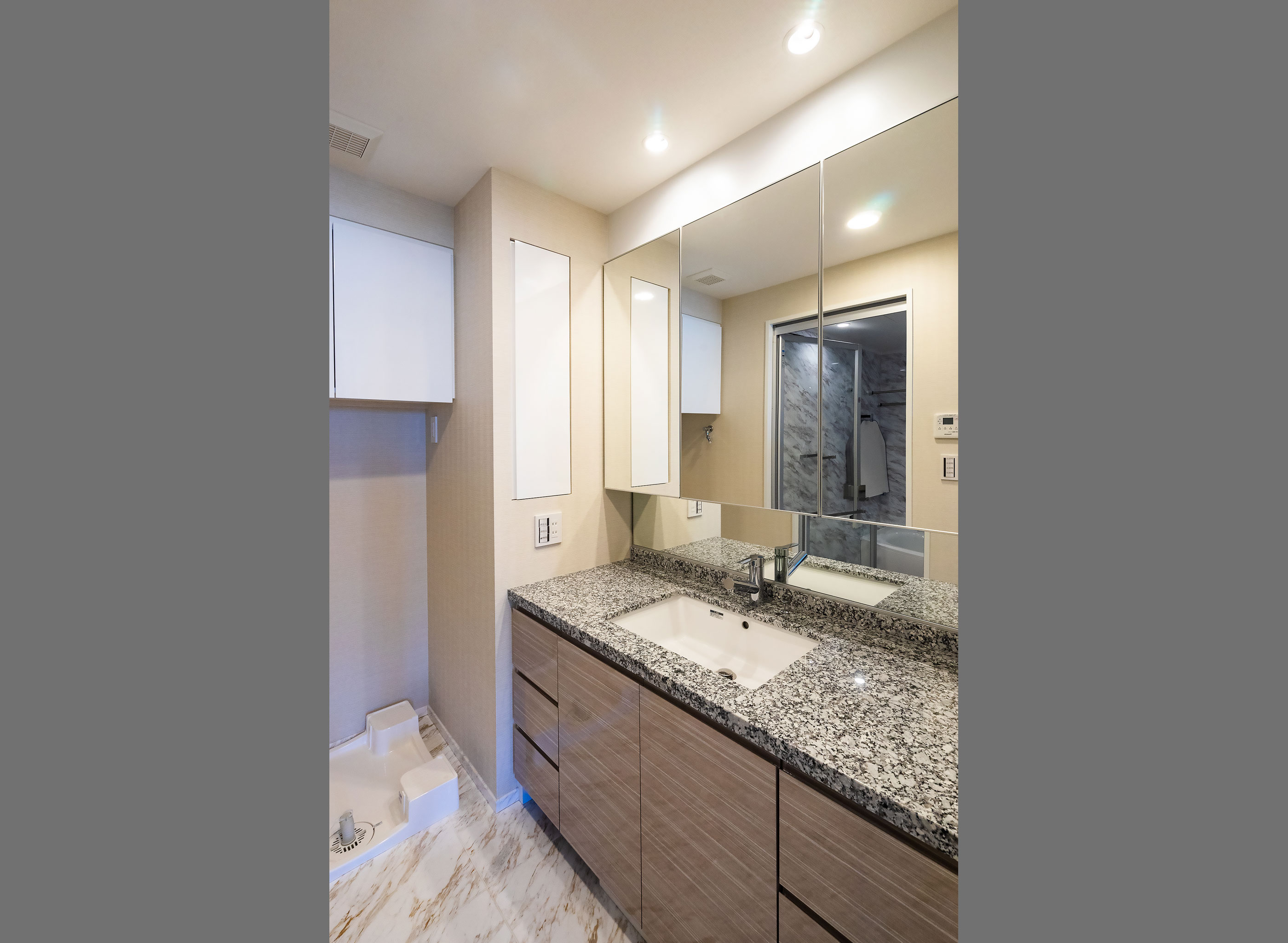 シューズインクロゼット等の豊富な収納 - トップとサイドに天然石を設えた
